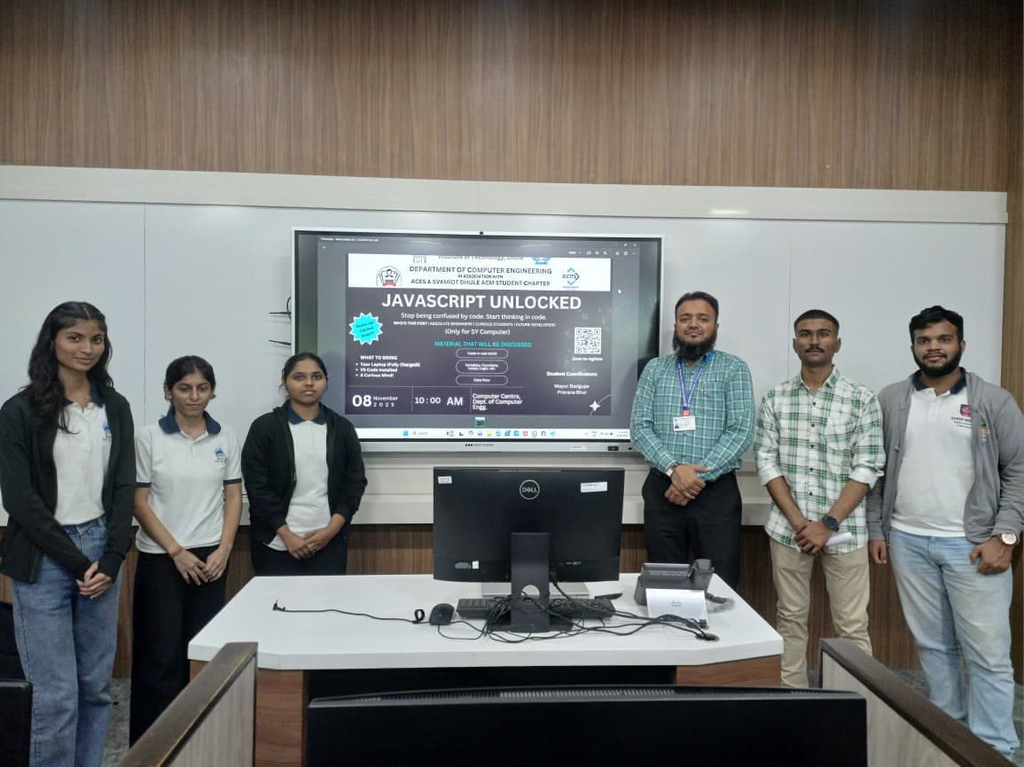The Department of Computer Engineering at SVKM's Institute of Technology, Dhule, in collaboration with the SVKM IoT ACM and ACES Student Chapter, organized 'JavaScript Unlocked.' This workshop brought together SY Computer students to simplify JavaScript concepts and enhance coding skills through hands-on learning and practical exercises.